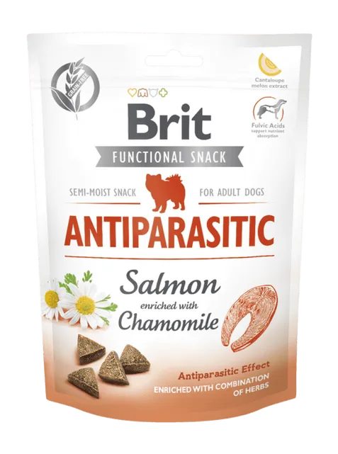 Friandises semi-molles fonctionnelles pour chiens, enrichies en ingrédients fonctionnels. Recette à base de saumon enrichi en camomille aux propriétés antiparasitaires.