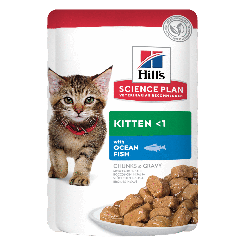 Votre chaton adorera le goût des morceaux tendres en sauce pour chats HILL’S SCIENCE PLAN Kitten au poisson de mer. Ils offrent l’équilibre parfait entre goût et nutrition pour votre chaton. Précisément équilibrés pour fournir la quantité d’énergie appropriée pour soutenir le poids corporel idéal des chatons <1 an.