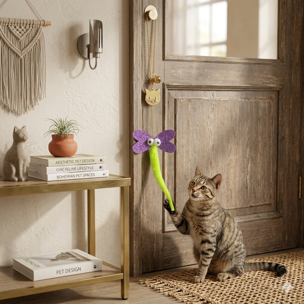 La vie en intérieur peut parfois être monotone pour nos petits félins. Notre jouet Suspendu pour animaux de compagnie a été spécialement conçu pour briser cette routine en exploitant l’espace vertical de votre maison. Suspendue à un cordon élastique ultra-réactif, cette libellule imite à la perfection les mouvements saccadés et imprévisibles des insectes, déclenchant instantanément l’instinct de bondissement de votre chat.