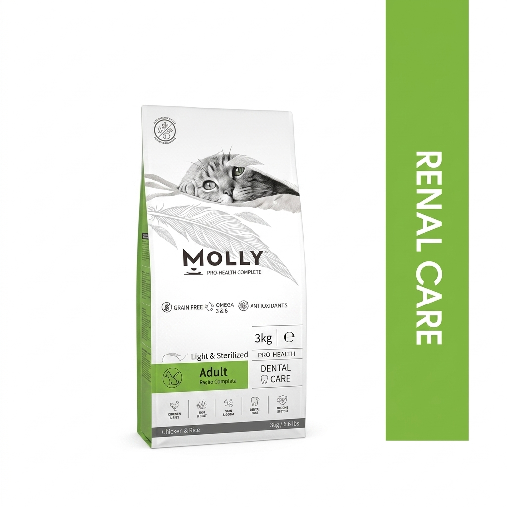 MOLLY RENAL CARE Stérilisé est formulé par des spécialistes en nutrition animale pour les chats en surpoids et/ou stérilisés.