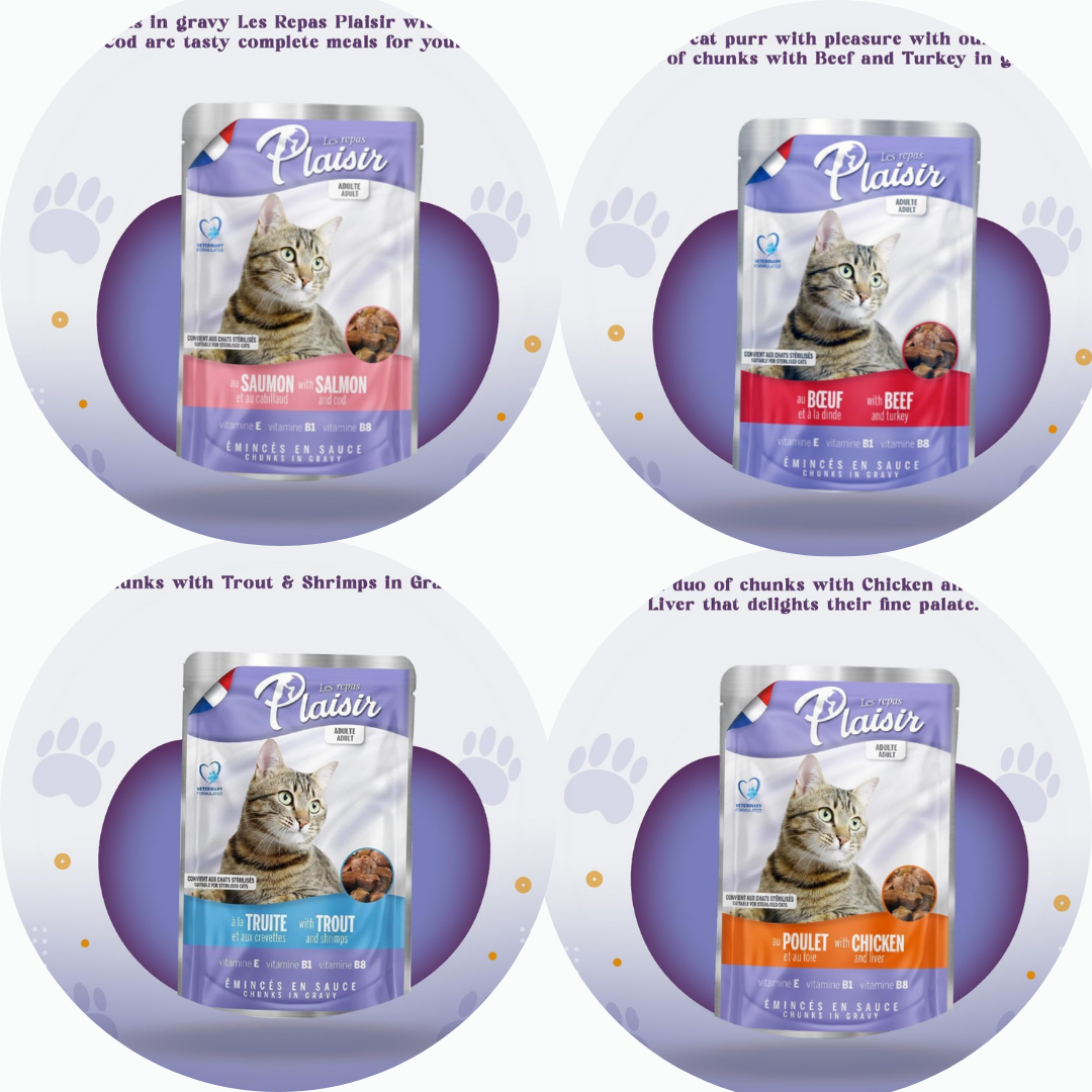 Les Repas Plaisir est une alimentation complète et équilibrée, formulée avec des vétérinaires, offrant une variété de textures et de saveurs, et fabriquée en France. Sans colorants. Convient aux chats adultes stérilisés.
