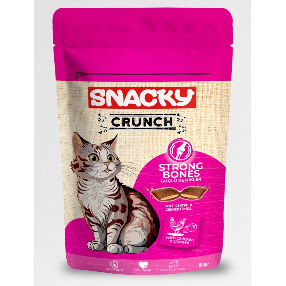 Les friandises sèches Snacky Crunch contribuent à la protection des dents et assurent une haleine fraîche. Leur formule enrichie en collagène garantit une peau saine et un pelage magnifique. Les prébiotiques favorisent une bonne digestion et la glucosamine contribue à la santé des articulations. La taurine améliore la vue et les vitamines C et E renforcent le système immunitaire.